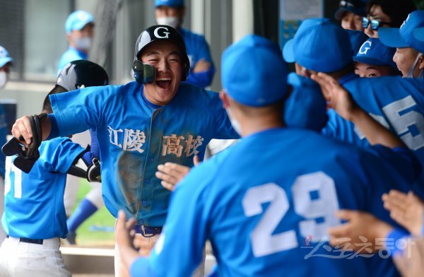 10일 서울 목동야구장에서 ‘제75회 황금사자기 전국고교야구대회 겸 주말리그 왕중왕전’ 8강전 인천고와 강릉고의 경기가 열렸다. 1회말 2사 2루 강릉고 5번 정승우의 1타점 우전 3루타 때 2루주자 김예준이 득점에 성공한 후 더그아웃에서 동료들과 기쁨을 나누고 있다.