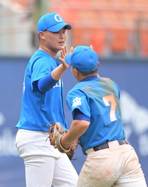 10일 서울 목동야구장에서 ‘제75회 황금사자기 전국고교야구대회 겸 주말리그 왕중왕전’ 8강전 인천고와 강릉고의 경기가 열렸다. 8회초 수비를 마친 뒤 강릉고 최지민과 2루수 정준재가 하이파이브를 하고 있다.