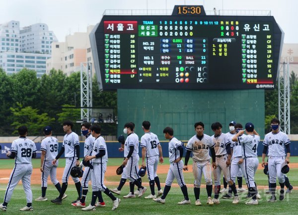 10일 서울 목동야구장에서 ‘제75회 황금사자기 전국고교야구대회 겸 주말리그 왕중왕전’ 8강전 유신고와 서울고의 경기가 열렸다. 서울고가 유신고에 2-9로 7회말 콜드패한 뒤 선수들이 아쉬워하고 있다.