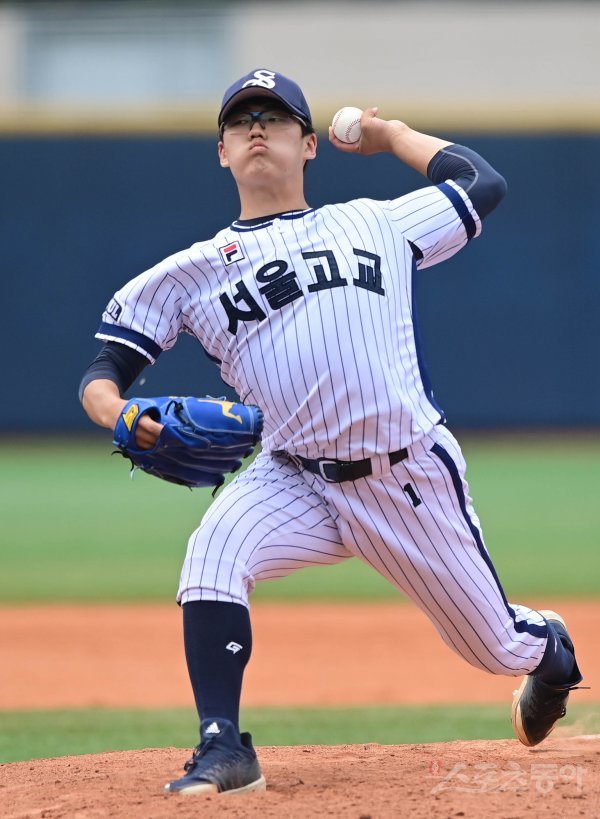 10일 서울 목동야구장에서 ‘제75회 황금사자기 전국고교야구대회 겸 주말리그 왕중왕전’ 8강전 유신고와 서울고의 경기가 열렸다. 3회초 서울고 이병헌이 마운드에 올라 역투하고 있다.