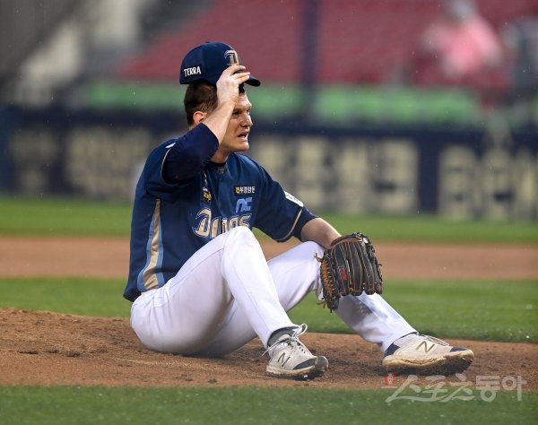 선발 투수로 등판한 NC 루친스키가 3회말 투구를 마치고 미끄러져 마운드에 앉아 있다.