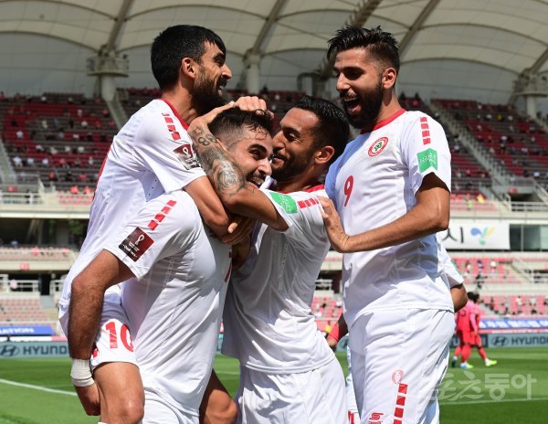 13일 고양종합운동장에서 열린 하나은행 후원 ‘2022 카타르 월드컵’ 아시아 지역 2차 예선 한국과 레바논의 경기에서 레바논 사드가 전반전에 선제골을 성공시킨 후 동료와 기쁨을 나누고 있다.