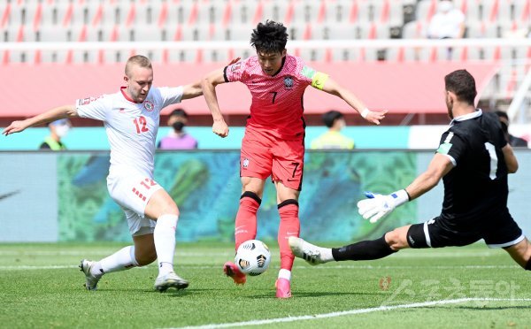 13일 경기도 고양 종합운동장에서 열린 ‘2022 카타르월드컵’ 아시아지역 2차예선 조별리그 한국과 레바논의 경기에서 한국 손흥민이 골키퍼를 앞에 두고 슛을 쏘고 있다.