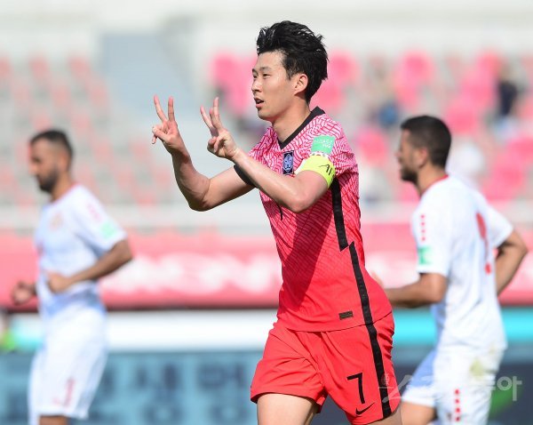 13일 고양종합운동장에서 열린 하나은행 후원 ‘2022 카타르 월드컵’ 아시아 지역 2차 예선 한국과 레바논의 경기에서 손흥민이 후반전 역전 페널티킥을 성공시킨 후 세리머니를 하고 있다.