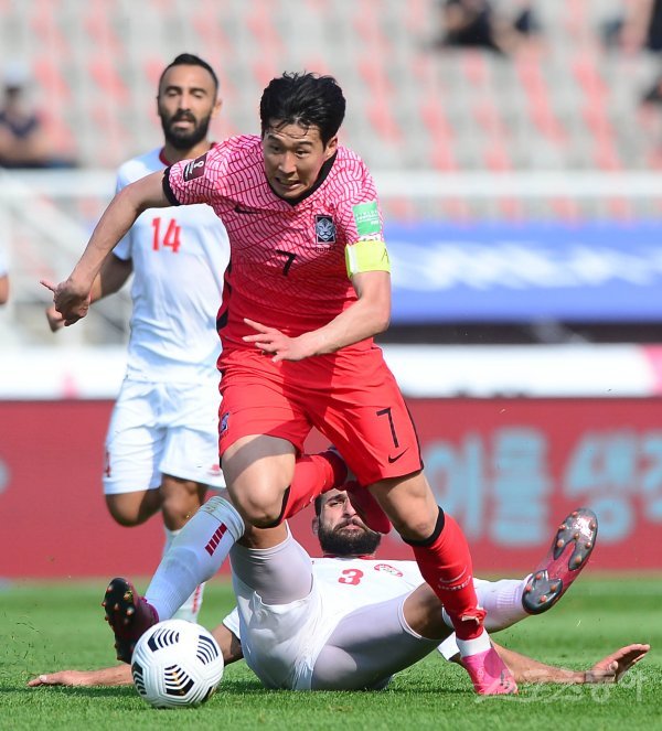 13일 고양종합운동장에서 열린 하나은행 후원 ‘2022 카타르 월드컵’ 아시아 지역 2차 예선 한국과 레바논의 경기에서 손흥민이 레바논 수비를 뚫고 드리블 돌파를 하고 있다.
