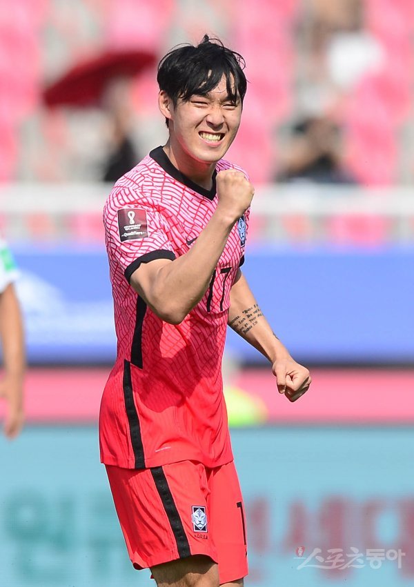 13일 고양종합운동장에서 열린 하나은행 후원 ‘2022 카타르 월드컵’ 아시아 지역 2차 예선 한국과 레바논의 경기에서 송민규가 전반전에 동점골을 성공시킨 후 세리머니를 하고 있다.