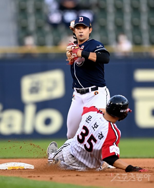 6회말 무사 1루 LG 내야 땅볼 때 두산 강승호가 1루주자를 포스 아웃시킨 후 1루로 송구하고 있다.