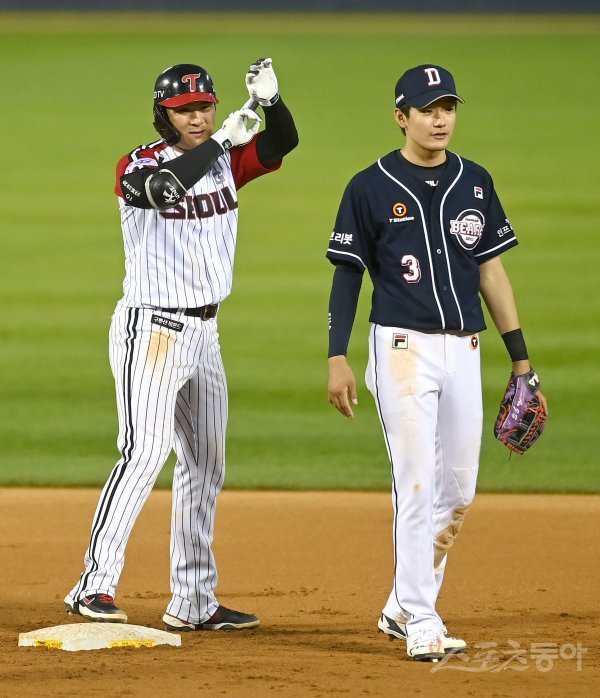 7회말 1사 1,2루 LG 오지환이 1타점 우전 2루타를 치고 2루에서 기뻐하고 있다.