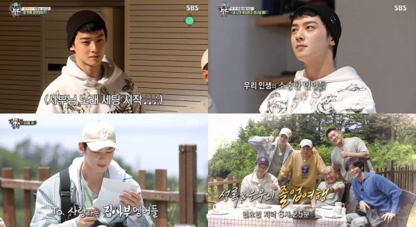 계속해서 ‘울릉 천국’을 소개하던 이장희는 ‘내 나이 육십 하고 하나일 때’를 듣고 감동받은 멤버들에게 각자의 삶을 가사로 담아 보는 시간을 제안했다. 차은우는 신성록과 함께 “언제나 사랑한 건 내 형들”이라며 ‘집사부일체’ 멤버들을 처음 만났던 순간부터 지금까지의 모습을 가사로 녹여, 자신의 인생에 소중한 인연들에게 감사의 뜻을 전해 모두를 뭉클하게 했다.