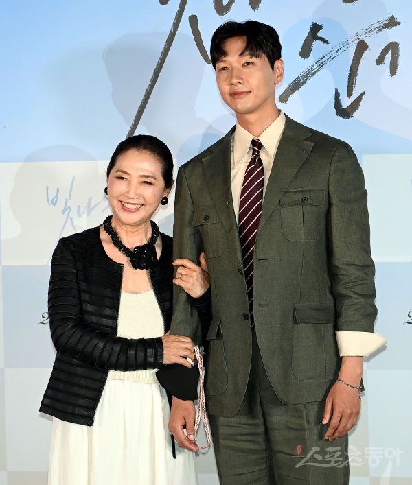 14일 서울 CGV용산아이파크몰에서 열린 영화 ‘빛나는 순간’ 언론 시사회에 참석한 고두심, 지현우가 카메라를 향해 포즈를 취하고 있다.