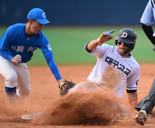 1회초 무사 2루 대구고 2번 진현제의 우전 안타 때 1루주자 이재용이 3루로 파고들어 세이프 되고 있다.