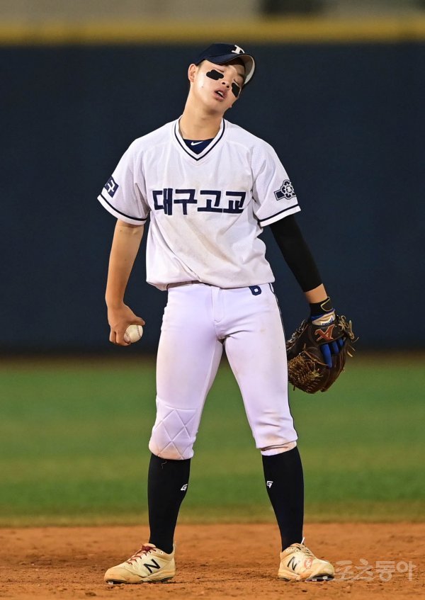 5회말 2사 1, 3루 강릉고 1번 김영후의 내야 땅볼 때 대구고 유격수 박현민이 타구를 놓쳐 실책을 저지른 뒤 아쉬워하고 있다.