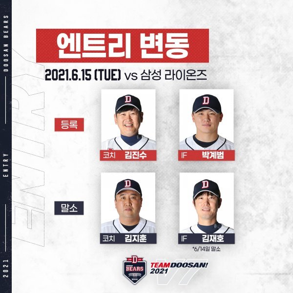두산은 2군에 머물던 김진수 코치(42)를 1군으로 올리고, 기존 김지훈 코치(48)를 1군 엔트리에서 말소했다. 김태형 감독은 경기 시작에 앞서 “내가 결정했고, 별 다른 사유는 없다. 한 번씩 경험한다는 의미로 보면 된다. 잔류군까지 변동이 있다”고 설명했다.