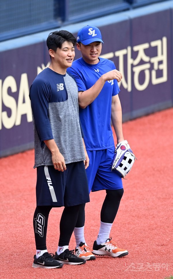 15일 서울 잠실야구장에서 ‘2021 신한은행 SOL KBO리그’ 삼성 라이온즈와 두산 베어스 경기가 열린다. 1군에 콜업된 두산 박계범이 삼성 박해민과 이야기하고 있다.