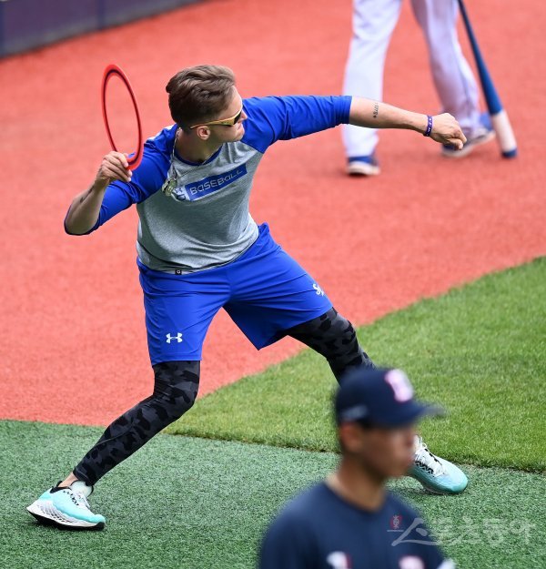 15일 서울 잠실야구장에서 ‘2021 신한은행 SOL KBO리그’ 삼성 라이온즈와 두산 베어스 경기가 열린다. 경기 전 삼성 뷰캐넌이 원반 던지기를 하고 있다.