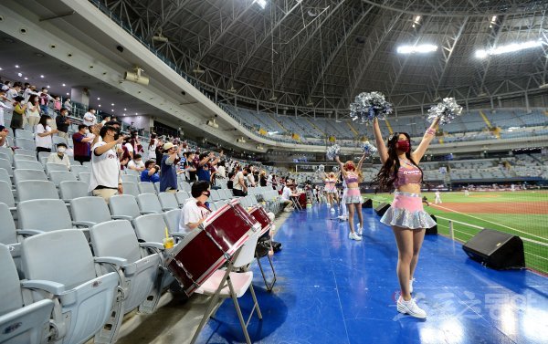 코로나19 사회적 거리두기 관람인원 확대 방침으로 고척돔에 20%관중이 늘어난 가운데 야구팬들이 경기를 보고 있다.