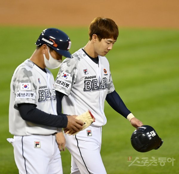 4회말 무사 두산 박건우가 자신의 타구에 맞고 삼성 김대우가 병원으로 이송되자 고개를 떨구고 있다다.