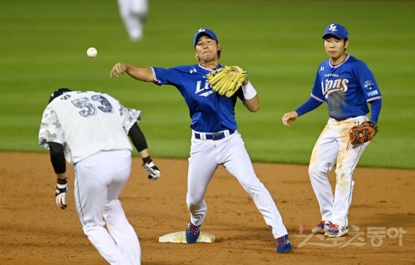 4회말 무사 1만루 두산 내야 땅볼 때 삼성 김상수가 1루주자를 포스 아웃시킨 후 1루로 송구하고 있다.