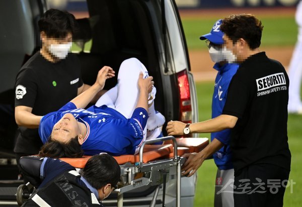 삼성 선발 김대우가 4회말 무사 두산 박건우의 타구에 맞아 들것에 실려나가고 있다.