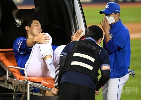 삼성 선발 김대우가 4회말 무사 두산 박건우의 타구에 맞아 들것에 실려나가며 박건우의 사과에 괜찮다며 손을 흔들고 있다.