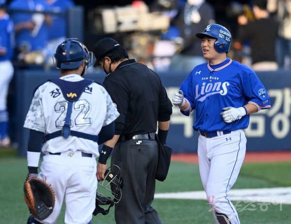 1회초 2사 만루 삼성 이원석이 좌월 만루 홈런을 날리고 그라운드를 돌아 홈인해 하이파이브 하고 있다.