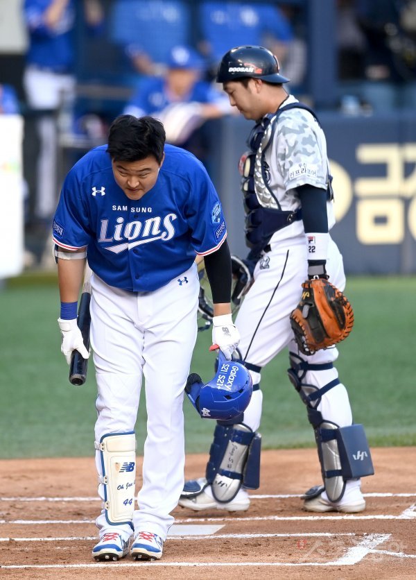 1회초 1사 만루 삼성 오재일이 타석에 들어서며 두산 팬들에게 인사하고 있다.