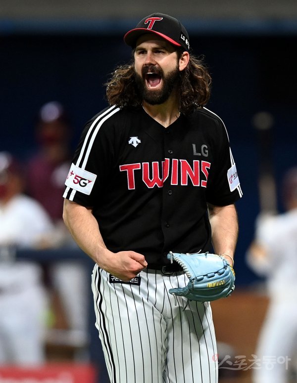 5회말 1사 만루에서 LG 켈리가 병살 아웃으로 실점 위기를 넘긴 뒤 포효하고 있다.