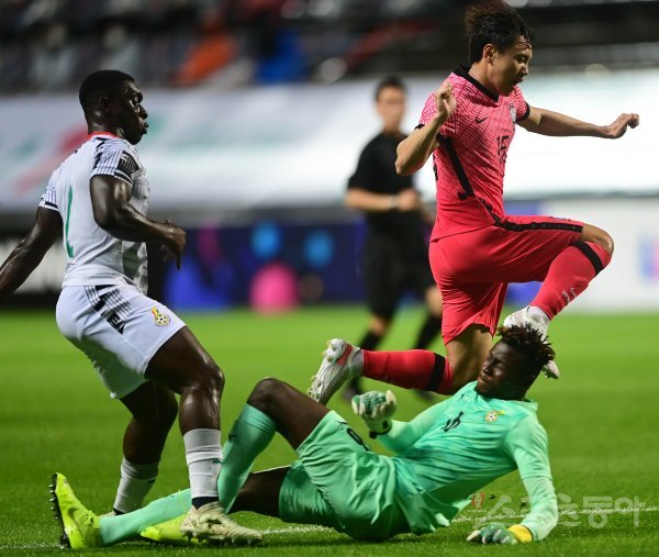 15일 제주월드컵경기장에서 열린 하나은행 초청 U-24 올림픽 축구대표팀 평가전 한국과 가나의 경기에서 조영욱이 슈팅을 시도했지만 가나 골키퍼 에수에게 막히고 있다.