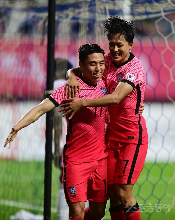 15일 제주월드컵경기장에서 열린 하나은행 초청 U-24 올림픽 축구대표팀 평가전 한국과 가나의 경기에서 이동준이 후반전에 추가골을 성공시킨 뒤 이승우와 기쁨을 나누고 있다.