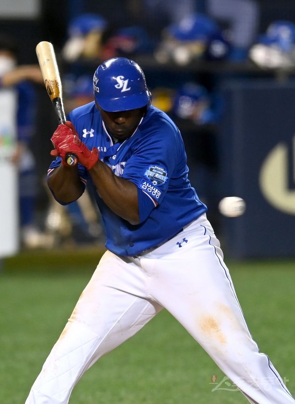 8회초 2사 3루 삼성 피렐라가 데브볼에 맞고 있다.