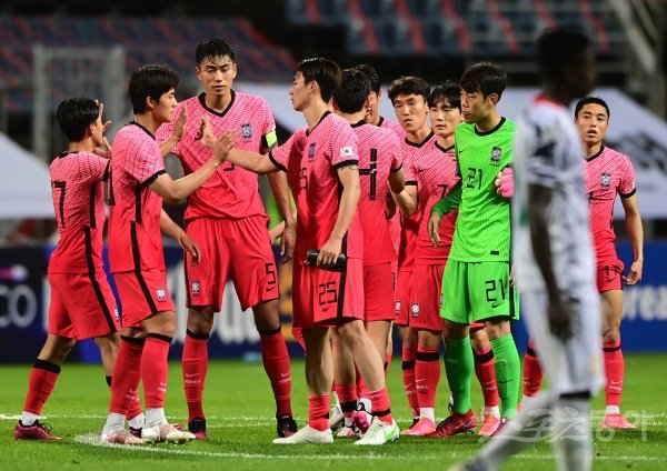 15일 제주월드컵경기장에서 열린 하나은행 초청 U-24 올림픽 축구대표팀 평가전 한국과 가나의 경기에서 한국이 가나에 2-1로 승리를 거둔 뒤 선수들이 기쁨을 나누고 있다.