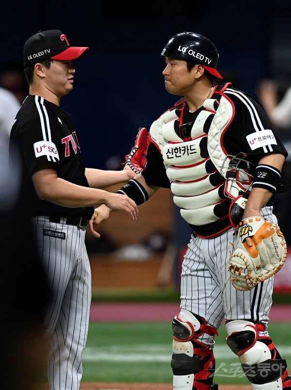 9회말 LG 마무리 고우석이 구원 등판해 승리를 지킨 뒤 유강남과 기쁨을 나누고 있다.