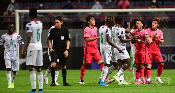 15일 제주월드컵경기장에서 열린 하나은행 초청 U-24 올림픽 축구대표팀 평가전 한국과 가나의 경기에서 이동경이 가나 선수들과 신경전을 벌이고 있다.