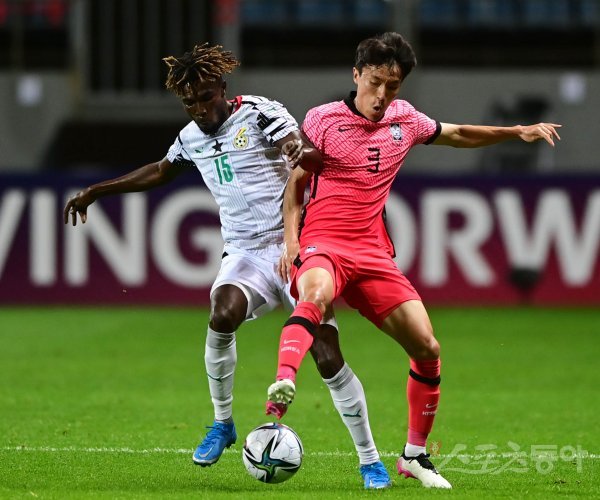 15일 제주월드컵경기장에서 열린 하나은행 초청 U-24 올림픽 축구대표팀 평가전 한국과 가나의 경기에서 김진야가 가나 보아키의 공을 빼앗고 있다.