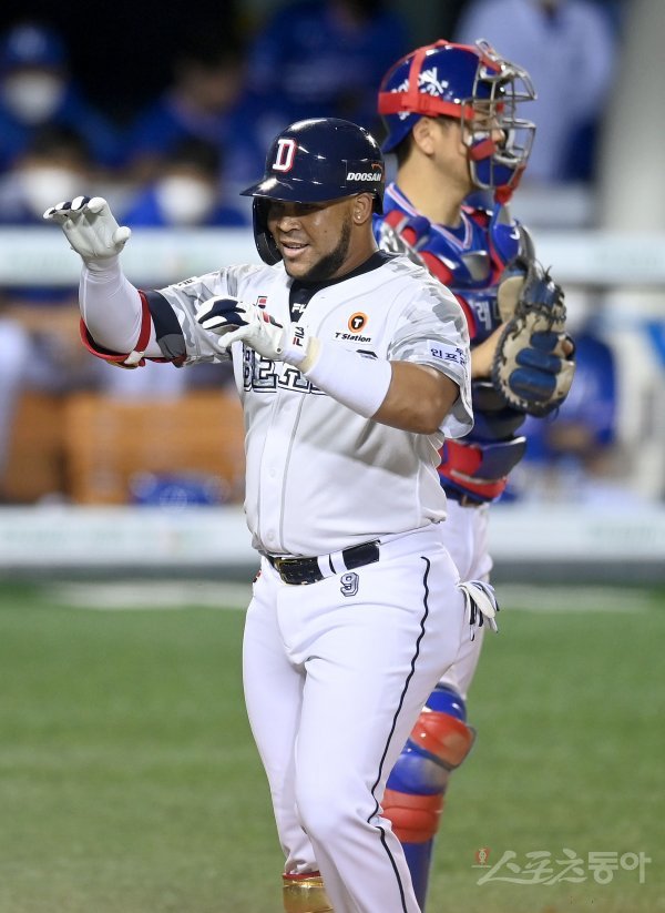 8회말 2사 1루 두산 페르난데스가 우중월 투런 홈런을 날리고 그라운드를 돌아 홈인해 하이파이브 하고 있다.