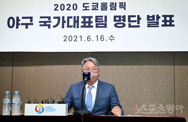 16일 서울 도곡동 야구회관에서 열린 ‘2020 도쿄올림픽’ 야구 국가대표팀 명단 발표 행사에 참석한 김경문 야구국가대표팀 감독이 취재진의 질문에 답하고 있다.