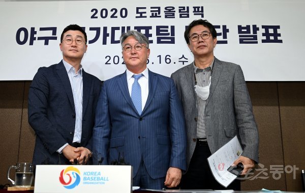 16일 서울 도곡동 야구회관에서 열린 ‘2020 도쿄올림픽’ 야구 국가대표팀 명단 발표 행사에 참석한 이종열 코치, 김경문 야구국가대표팀 감독, 김시진 기술위원장이 포즈를 취하고 있다.