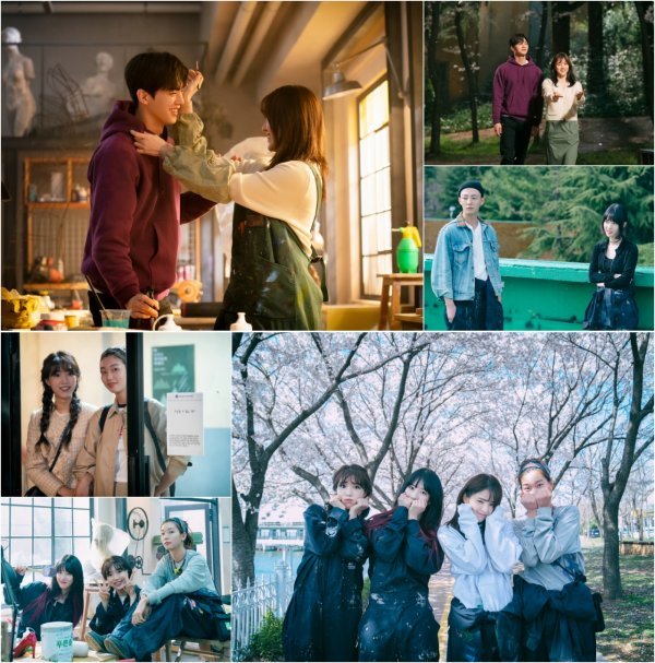 이날 공개된 사진 속 한소희, 송강, 양혜지, 김민귀, 이호정, 윤서아 등 함께 해서 더욱 빛나는 케미스트리가 설렘을 자아낸다. 먼저, 작업실에서 벚꽃길까지 이어지는 유나비와 박재언의 달콤한 순간들이 심장을 두근거리게 한다. 시크하고 쿨한 ‘여사친’ 오빛나(양혜지 분)와 ‘남사친’ 남규현(김민귀 분)의 투샷도 흥미롭다. 걸크러시와 러블리함이 어우러진 윤솔(이호정 분), 서지완(윤서아 분) 조합 역시 시선을 사로잡는다. 특히, 흐드러지게 핀 벚꽃 아래 한소희, 양혜지, 이호정, 윤서아의 사랑스러운 모먼트가 보여줄 ‘찐친’ 시너지를 더욱 기대케 한다.
