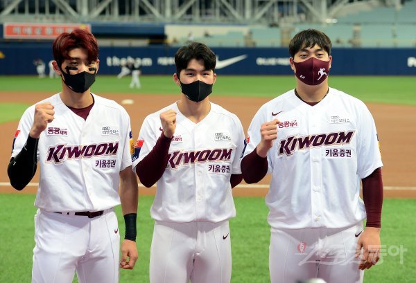 경기에 앞서 도쿄올림픽 야구 대표팀에 선정된 키움 이정후, 김혜성, 조상우가 포즈를 취하고 있다.