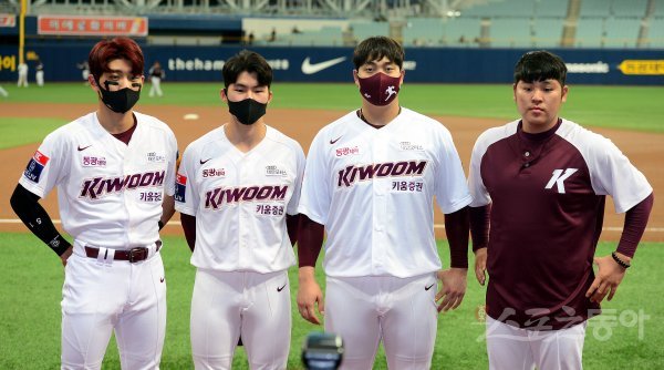 경기에 앞서 도쿄올림픽 야구 대표팀에 선정된 키움 이정후, 김혜성, 조상우, 한현희가 포즈를 취하고 있다.