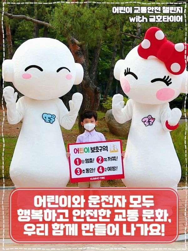 금호타이어(대표 정일택)가 ‘또로, 로로’ 캐릭터로 어린이 교통안전 릴레이 챌린지에 동참한다. ‘또로, 로로’ 캐릭터는 금호타이어 페이스북 및 엑스타TV에 ‘1단멈춤, 2쪽저쪽, 3초동안, 4고예방’ 슬로건을 공유하고 어린이 보호구역 교통안전 수칙 지키기 캠페인에 힘을 더했다. 이강승 금호타이어 G.마케팅담당 상무는 “앞으로도 운전자와 보행자, 어린이들의 안전을 책임지는 기업으로서 최선을 다하겠다”고 말했다.