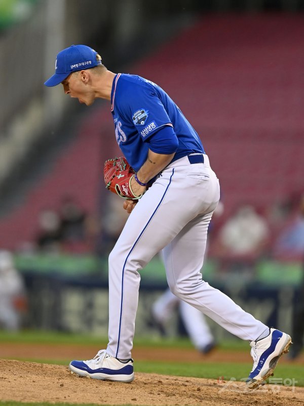 선발 투수로 등판한 삼성 뷰캐넌이 4회말 무사 2,3루 상황을 무실점으로 막은 후 포효하고 있다.