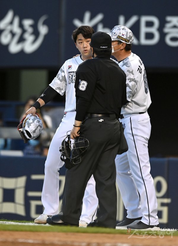 4회말 무사 2,3루 상황에서 삼진 아웃을 당한 두산 양석환이 이닝 교체 때 박근영 주심에게 항의하고 있다.