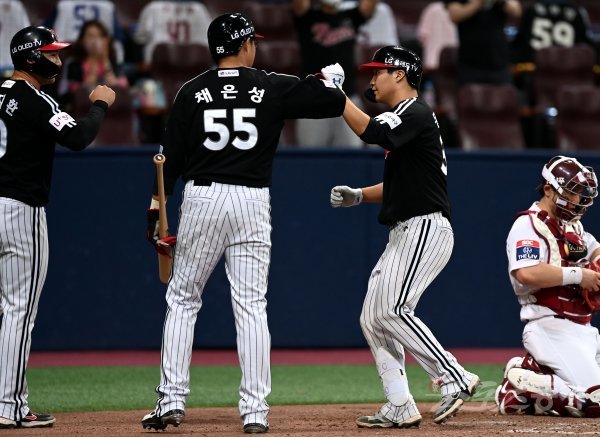 6회초 2사 1, 3루에서 LG 문보경이 역전 3점 홈런을 쏘아 올린 뒤 동료들과 기쁨을 나누고 있다.