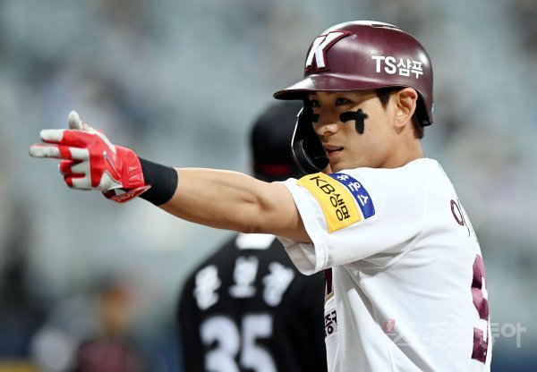 7회말 1사 1, 3루에서 키움 이정후가 1타점 역전 적시타를 날린 뒤 세리머니를 펼치고 있다.