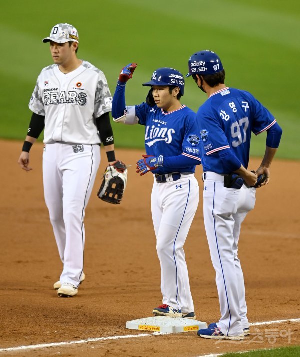 3회초 1사 삼성 김지찬이 중전 안타를 치고 1루에서 기뻐하고 있다.