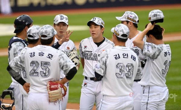 경기 전 두산 선수들이 모여 이야기를 나누고 있다.