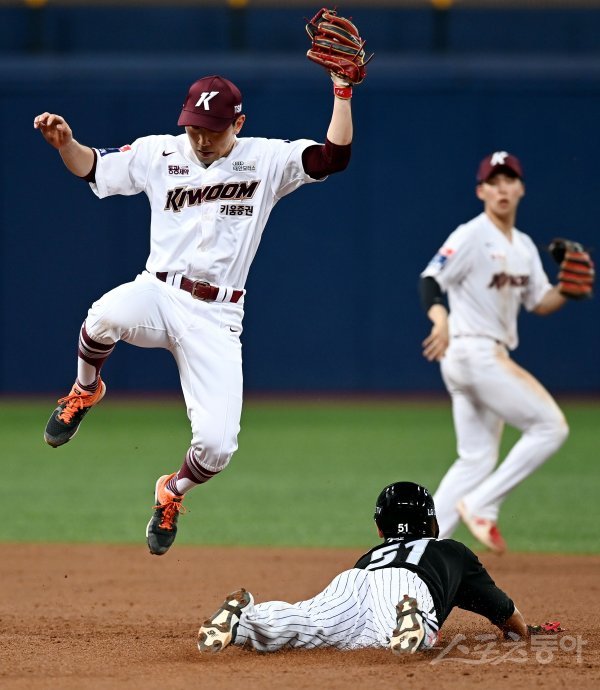 3회초 1사 1루에서 LG 홍창기의 2루 도루 때 키움 서건창이 높은 송구를 잡고 있다.