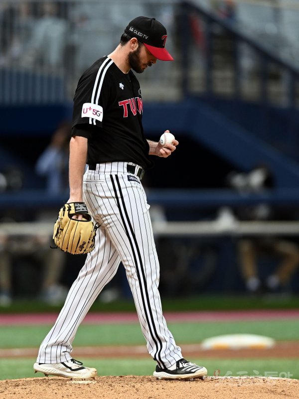 5회말 2사 만루에서 역전을 허용한 LG 선발 수아레즈가 고개를 숙이고 있다.