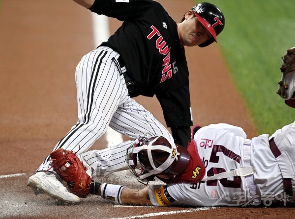 1회초 무사 1, 2루에서 동료의 2루타 때 LG 1루 주자 이형종이 홈득점을 노렸으나 키움 박동원에게 태그 아웃되고 있다.
